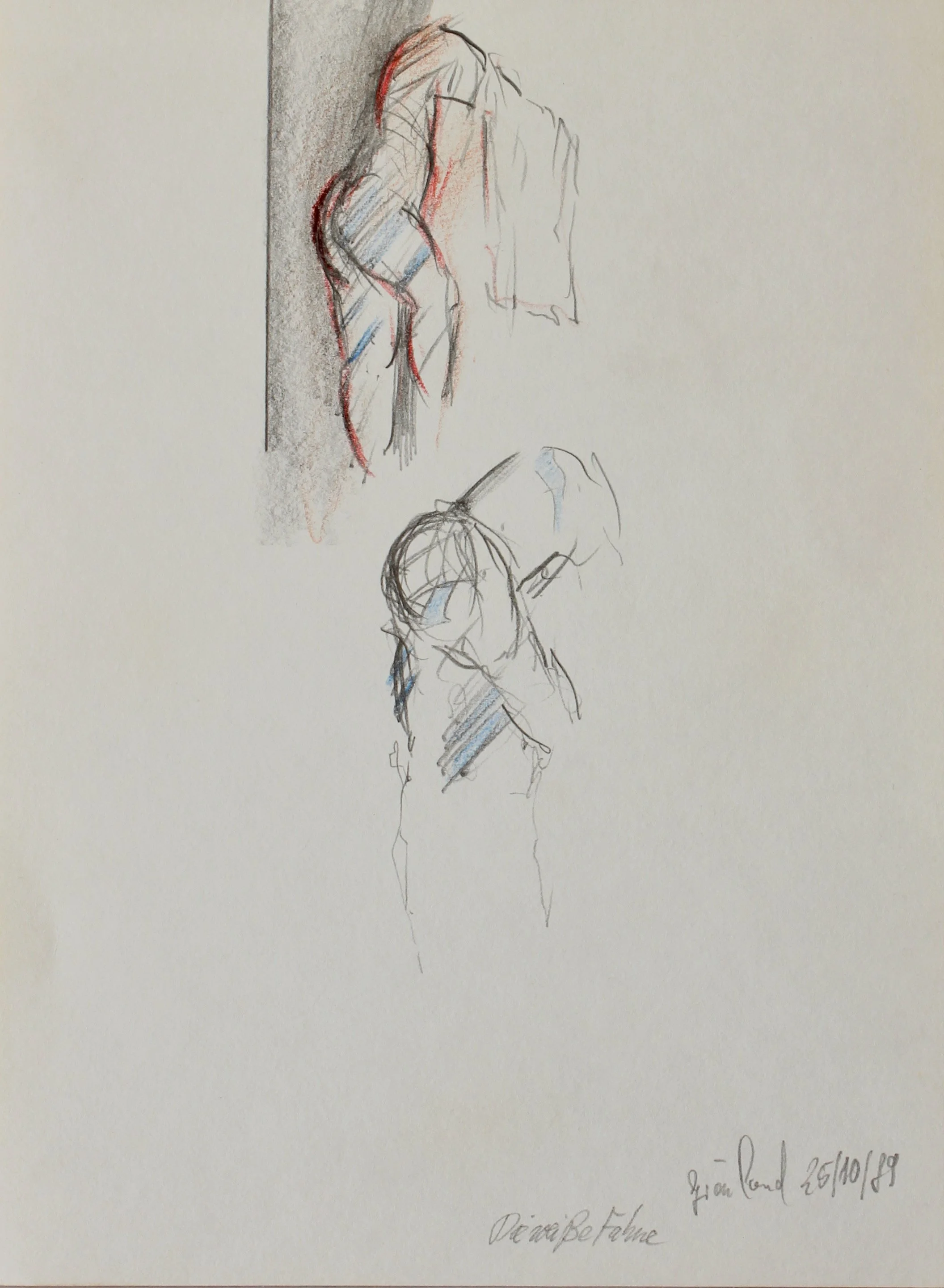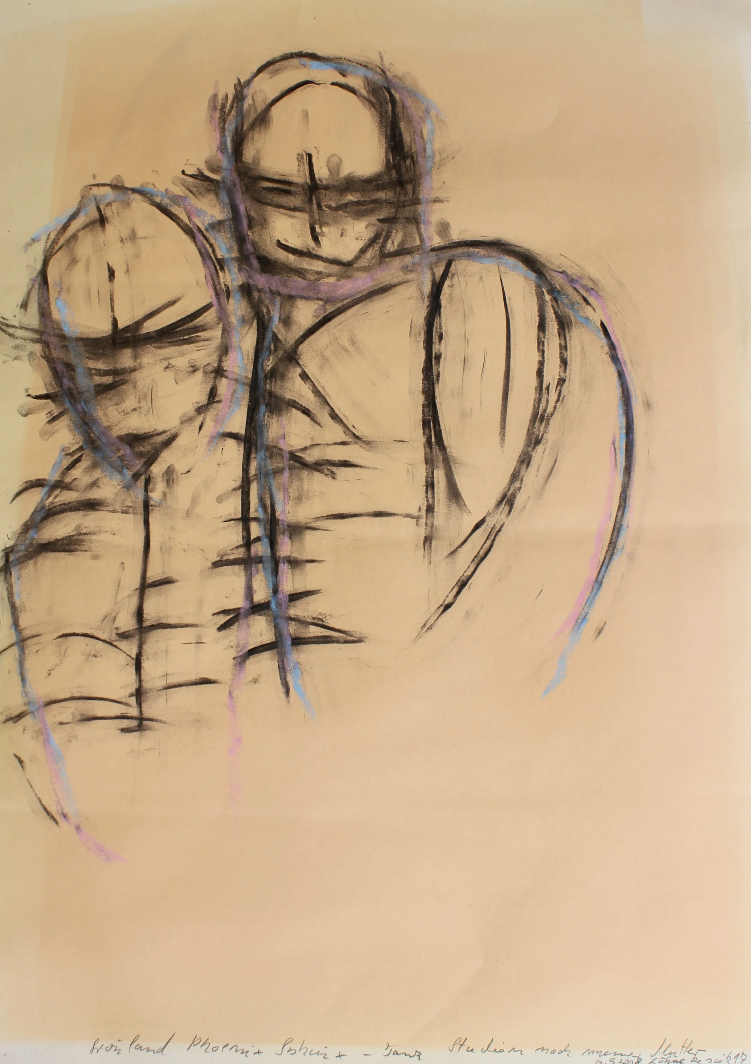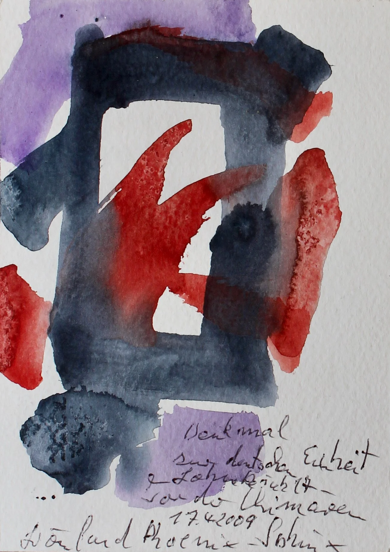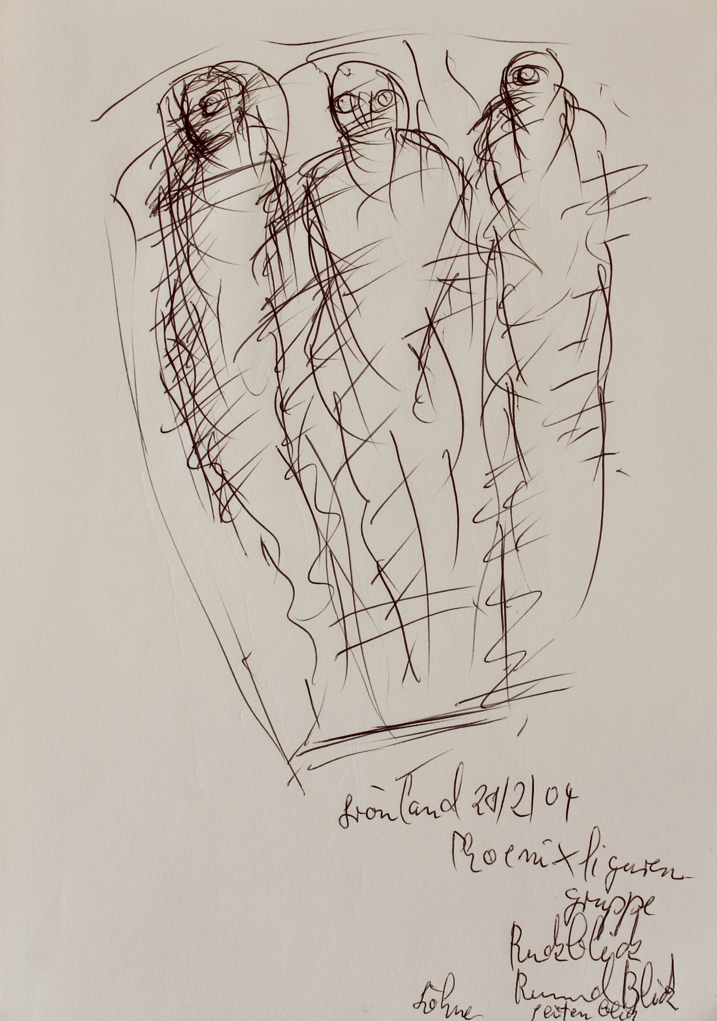 Tor vor den Chimären Phoenix-Postkarten Blei- und Farbstiftzeichungen Fadenkreuze Ananas T-Shirt Phoenixfigurengruppe Phoenix auf DIN A4 Aquarelle Der Tanz und oder der Phoenix Fahnen Phoenix Sphinx Butoh Große Figuren La Begude, Troja und Löhne Kreideköpfe Seestücke und Figuren Skizzenblöcke